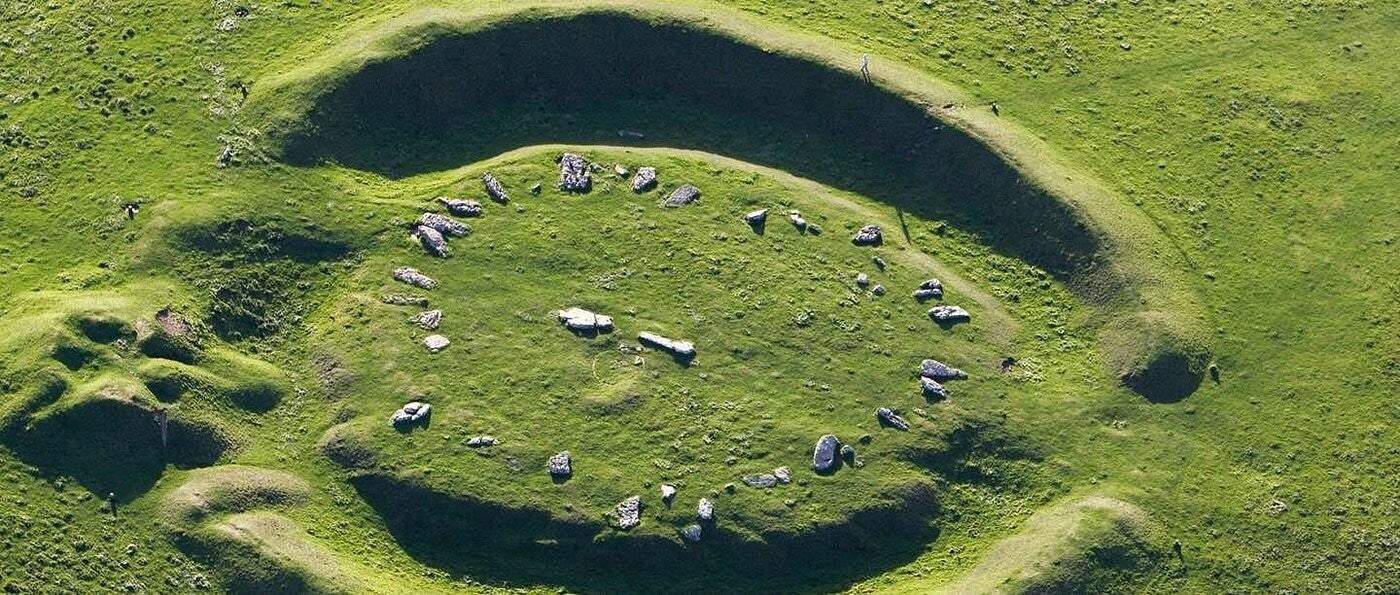 Arbor Low and Gib Hill form one of the most impressive complexes of prehistoric monuments in the Peak District monument that was started in the Neolithic period, probably between 3,000 and 2,500 BC, consisting of 42 stones in a 40-meter diameter circle. There have been no excavations on either site for more than 100 years, and the understanding of their date, function and sequence of building is far from complete. The barrow over the henge ditch and the round barrow at Gib Hill are undoubtedly later features, as may be the stone circle and cove within the henge monument.